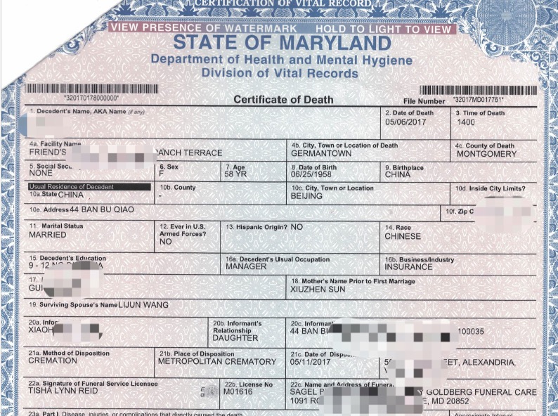 在美國意外或病故死亡的中國公民或美國公民,在涉及到中國國內房產(chǎn)或其他繼承權等問(wèn)題時(shí),國內相關(guān)辦事部門(mén)會(huì )要求家屬提供死者在美國的死亡證明。此死亡證明必須要經(jīng)過(guò)中國駐美大使館或者領(lǐng)事館的公證認證才能被國內機構認可。
